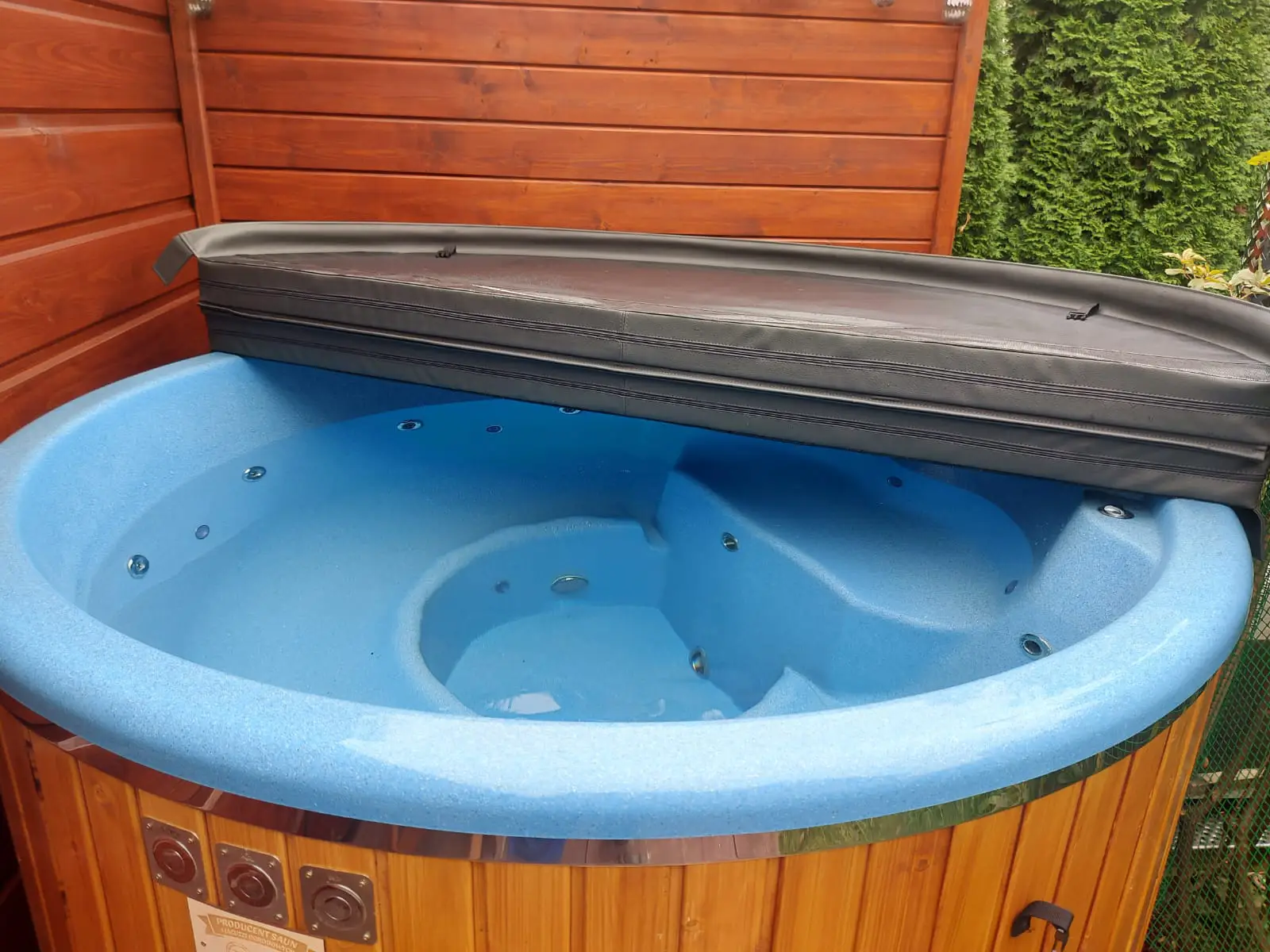 Pokrywa termiczna balii skutecznie chroni wnętrze przed liśćmi, kurzem i deszczówką, ale także przyspiesza proces nagrzewania się wody. Drewniana obudowa jacuzzi wykonana z drewna świerkowego jest trwała, elegancka i stabilna. Nie zniszczy jej mróz, silny wiatr i zmienna pogoda.