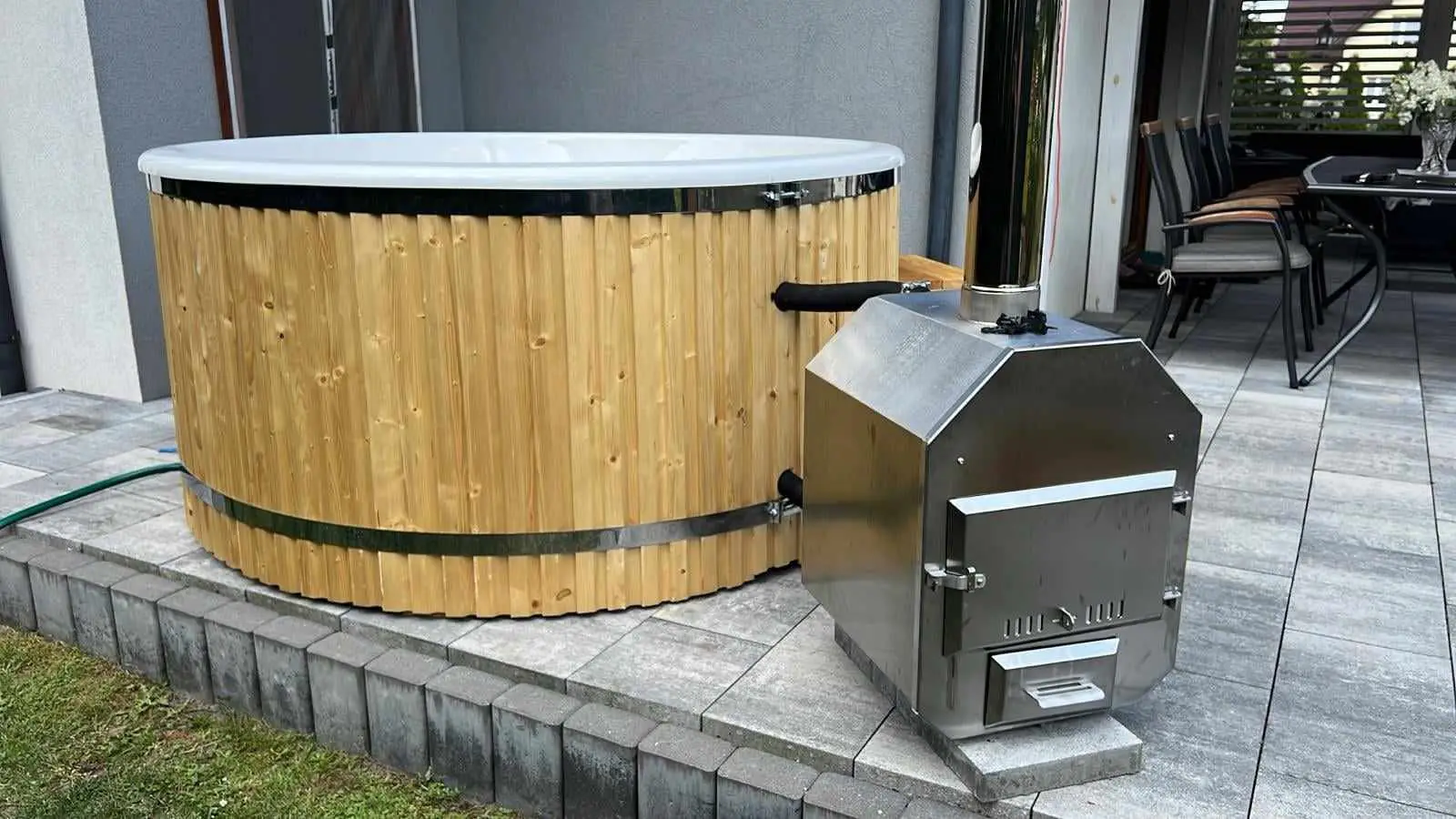 Woda w jacuzzi od Tiny House Design podgrzewana jest piecem zewnętrznym na drewno o mocy 35 kW lub piecem elektrycznym o mocy 12 kW. To Ty decydujesz o wyborze źródła ogrzewania. Obydwie metody są skuteczne. Palenie w piecyku ma jednak dodatkowy urok.